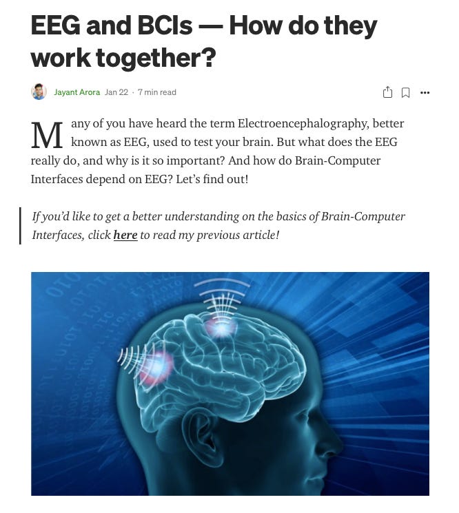 As mentioned in my previous newsletter, I planned on writing an article related to Brain-Computer Interfaces (BCIs). This month, I wrote an article on how EEG and BCIs are used together. Although this article was more focused on research rather than my personal opinion, learning about the connection between EEG data and brain machines was beneficial for my project (mentioned above).